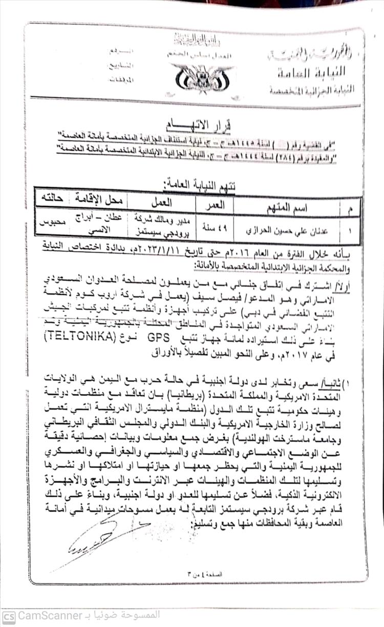وبحسب مذكرة صادرة عن النيابة الجزائية المتخصصة التابعة للحوثيين، فقد صدر الحكم بإعدام عدنان الحرازي وهو صاحب شركة برودجي سيستمز.
