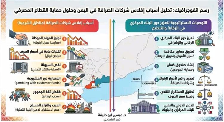 شهدت مدينة عدن والمحافظات الجنوبية موجة إفلاس لعدد من شركات الصرافة (قدرت بعض التقارير تأثر 40% من الشركات الصغيرة). الانفوجرافيك التالي يوضح اسباب افلاس بعض شركات الصرافة والحلول المقترحه لمعالجتها: