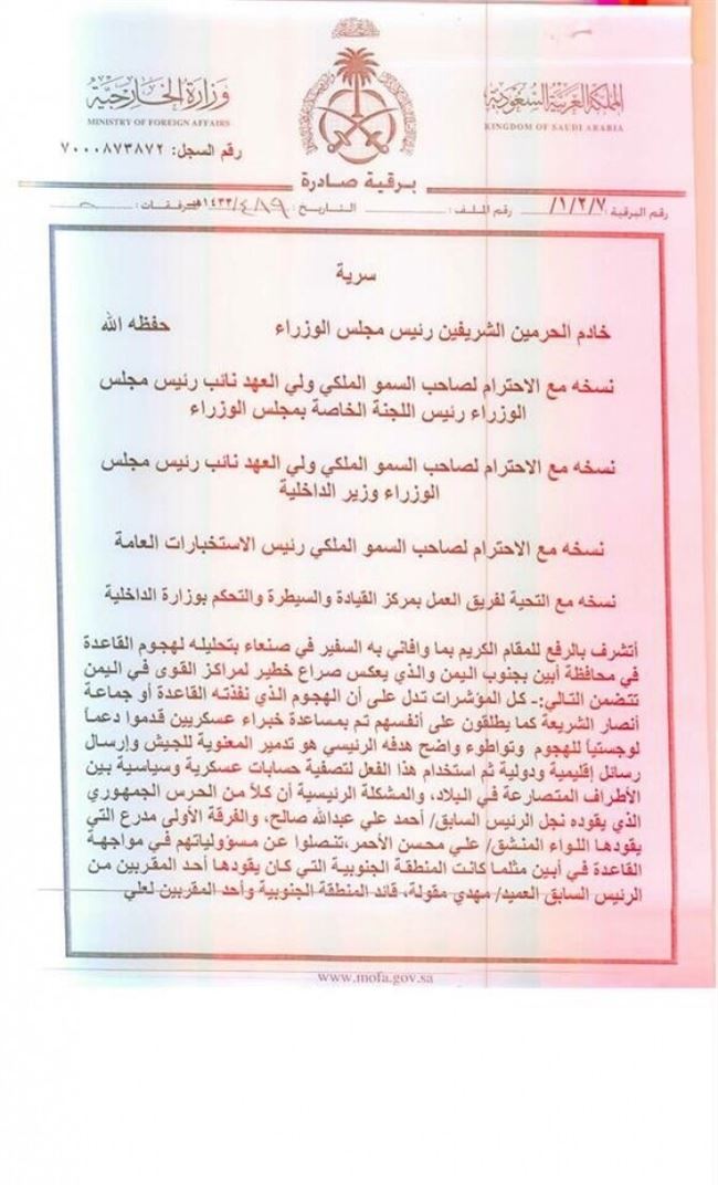 والى جانب هذه الوثيقة نشرت منظمة ويكليكس وثيقة أخرى هي عبارة رسالة من وزارة الخارجية موجهة إلى الملك "عبدالله" تتحدث حول هجوم تنظيم القاعدة على مدينة زنجبار بمحافظة أبين في العام 2011 .