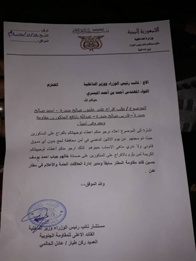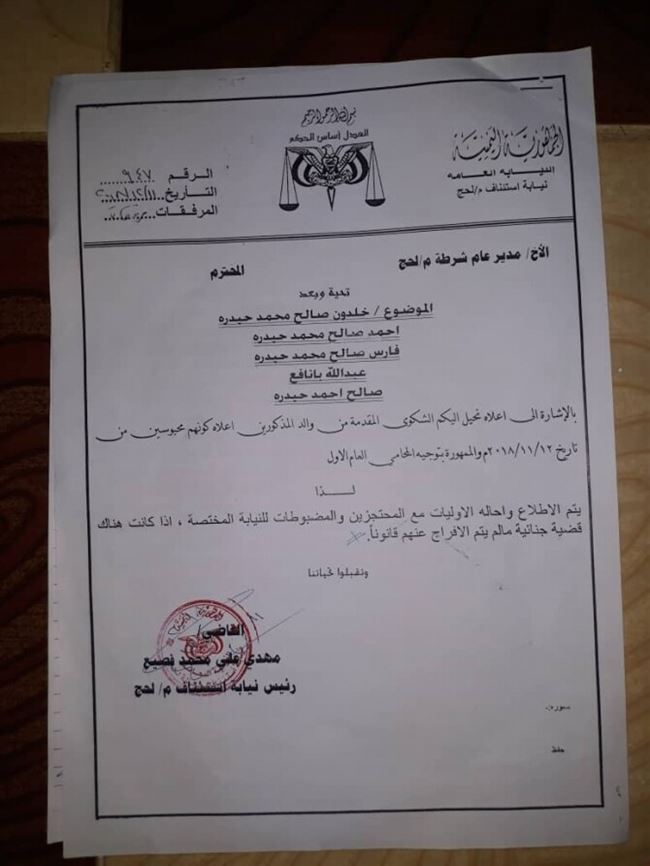 واشار إلى انه توجه بشكاوى متعددة إلى النائب العام وقيادة التحالف ومحافظ لحج لكن دون جدوى مطالبا بالكشف عن مصير اخوته وتحويلهم إلى البحث الجنائي والنيابة العامة ان كان عليهم مايدينهم.