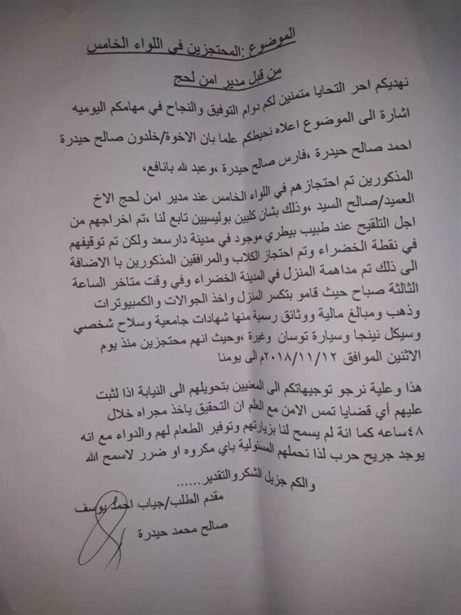 حضر إلى مقر صحيفة "عدن الغد" جياب احمد يوسف وهو موظف بمطار عدن الدولي شاكيا قيام امن لحج باحتجاز 5 من افراد عائلته.