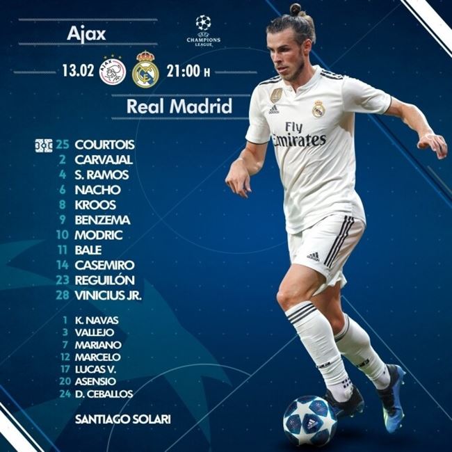 أعلن سانتياجو سولاري المدير الفني لريال مدريد عن تشكيلة فريقه الرسمية التي ستتواجد بعد قليل في أرضية الميدان لملعب “يوهان كرويف أرينا” لمواجهة أياكس في ذهاب دور الستة عشر من بطولة دوري أبطال أوروبا.