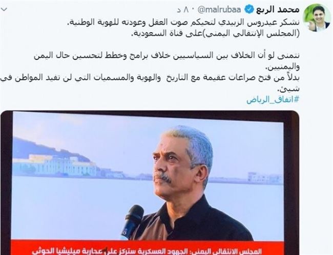 وقال الربع في تغريدة على حسابه بموقع "تويتر" معلقا على المسمى الجديد للمجلس الانتقالي في قناة السعودية الاخبارية "نشكر عيدروس الزبيدي لتحيكم صوت العقل وعودته للهوية الوطنية (المجلس الإنتقالي اليمني)على قناة السعودية.