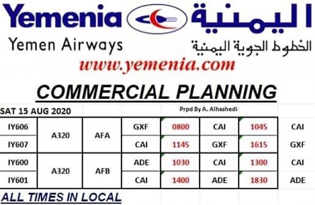 يسير اسطول اليمنية يوم غدا السبت  الموافق 15 اغسطس 2020م اربع رحلات جوية.