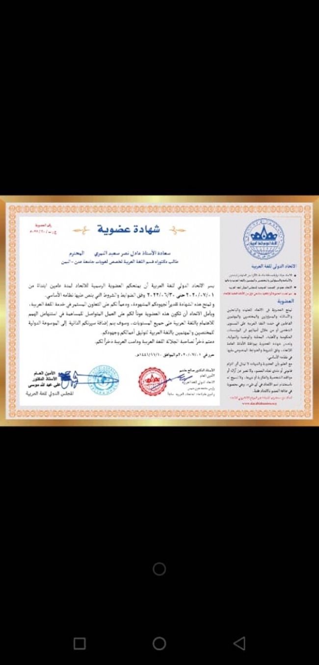 منح الاتحاد الدولي للغة العربية للاستاذ عادل نصر سعيد النمري طالب دكتوراة قسم اللغة العربية تخصص لغويات جامعة عدن  العضوية الرسمية للأتحاد الدولي الذي يرأسه الدكتور هاشم صالح عميد جامعة عين شمس.