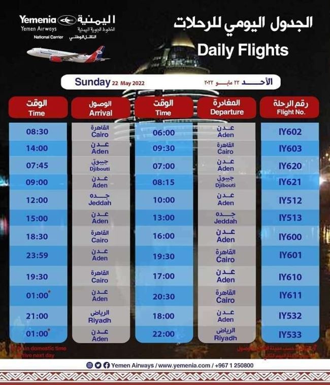 تسير الخطوط الجوية اليمنية، غدًا الأحد، مطار العاصمة عدن عدد من الرحلات الجوية بحسب الجدول التالي: