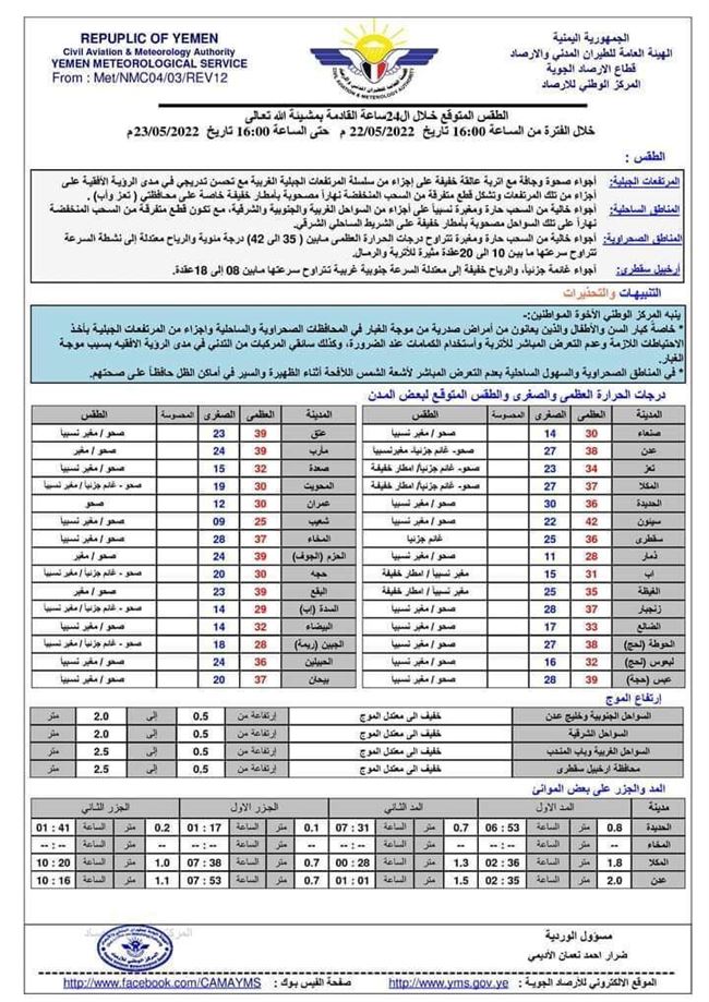 توقعت خدمة الأرصاد الجوية اليمنية خلال 24 ساعة قادمة أجواء صحوة وجافة مع اتربة عالقة خفيفة على أجزاء من سلسلة المرتفعات الجبلية الغربية مع تحسن تدريجي في مدى الرؤية الأفقية على أجزاء من تلك المرتفعات وتشكل قطع متفرقة من السحب المنخفضة نهاراً مصحوبة بأمطار خفيفة خاصة على محافظتي ( تعز وإب) .