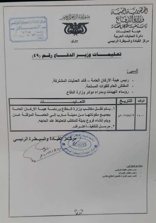 وكشفت وثيقة صادرة من مركز القيادة والسيطرة الرئيسي في عدن إلى رئيس هيئة الأركان العامة في مأرب بنقل مقر ومكاتب وزارة الدفاع من مأرب إلى العاصمة المؤقتة عدن .