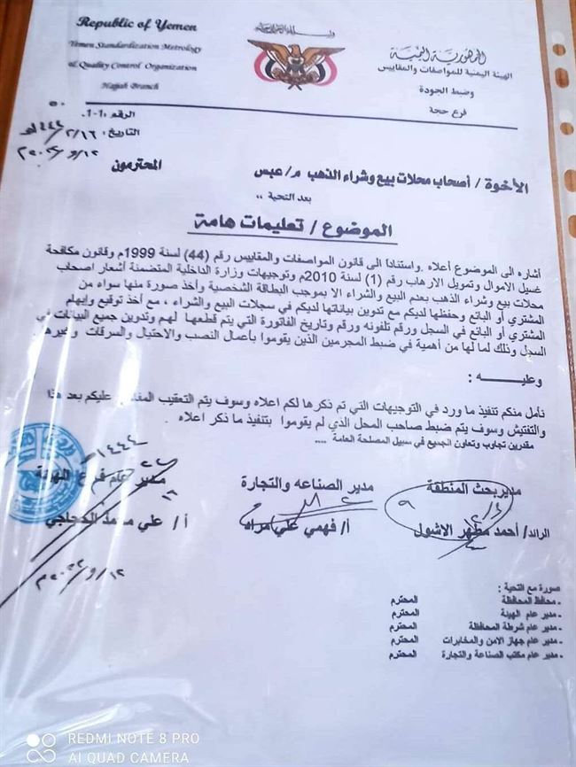 وأكد ملاك محلات الذهب أن القرار الحوثي يتذرع بقوانين هيئة المواصفات والمقاييس، فيما حقيقة القوانين تفرض مثل هذه الاجراءات إذا كانت قيمة الشراء فوق العشرة ملايين وليس من اجل خاتم ذهب.