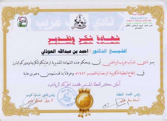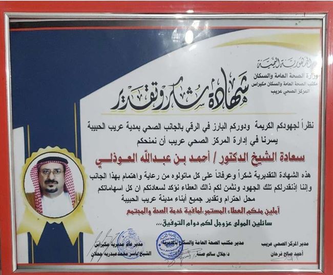 وتم اصدار عدة شهادات شكر من عدة جهات لدور الذي يقوم به الدكتور اجتماعياَ.