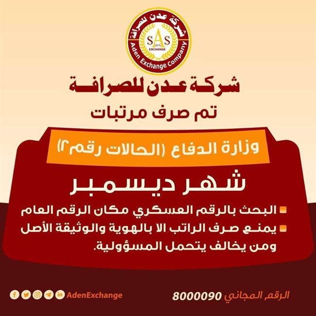 قال مصدر مسؤول في الدائرة المالية بوزارة الدفاع انه تم تدشين صرف رواتب شهر ديسمبر للعسكريبن من الحالات المعروفة بالشهداء والجرحى والقوى الجوية وملحقي الضابط.وأعلنت شركة عدن للصرافة، اليوم، عن بدء تدشين عملية صرف مرتبات وزارة الدفاع (الحالات رقم 2) لشهر ديسمبر.ودعت الشركة منتسبي وزارة الدفاع للحضور لاستلام مرتباتهم يدًا بيد أو من أي مصرف يتبع الشركة.