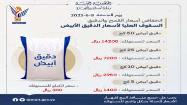 كما جاء في التعميم أن أسعار كيس القمح المطحون 50 كيلو جرام 13400 ريال، وعبوة 25 كيلو جرام بسعر 6750 ريالا وعبوة 10كيلو جرام بسعر 2750 ريالا و عبوة خمسة كيلو جرام بسعر 1400 ريال وسعر الكيلو جرام الواحد 280 ريالا.