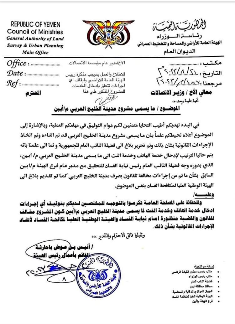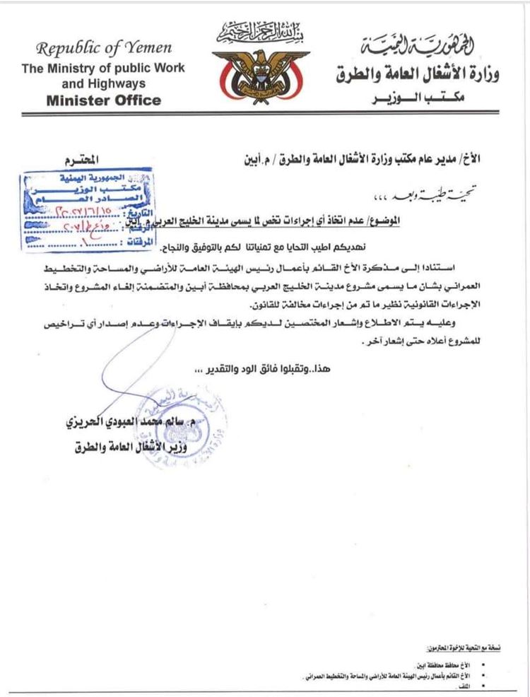 وجه وزير الاشغال العامة والطرق ، المهندس سالم محمد العبودي الحريزي ، مذكرة الى مدير عام مكتب وزارة الاشغال بابين ، وجهه فيها بايقاف اي اجراءات وعدم اصدار اي تراخيص لما يسمى "مشروع مدينة الخليج العربي" بمحافظة أبين.