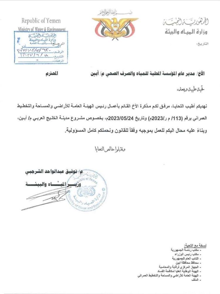 وجه معالي وزير المياه والبيئة المهندس توفيق الشرجبي ، مذكرة الى مدير مؤسسة المياه بابين ، حمله فيها كامل المسؤولية في حال صرف تراخيص لادخال المياه الى ما يسمى "مشروع مدينة الخليج العربي".