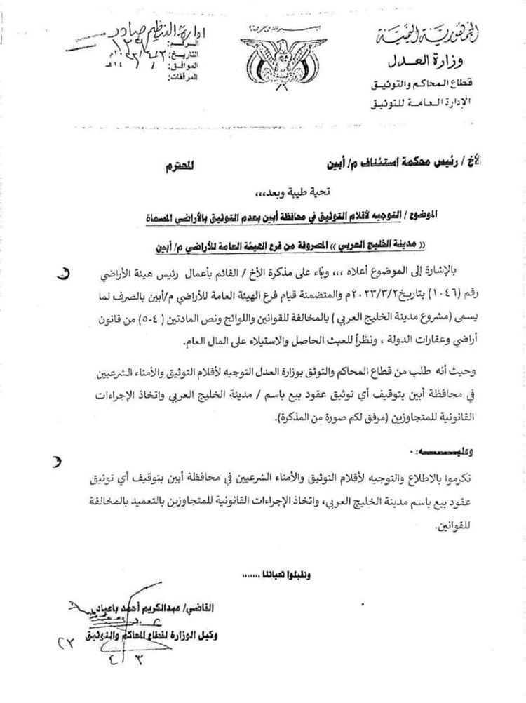 وجه فضيلة القاضي قيصر محمد محسن العيدروس ، رئيس محكمة استئناف محافظة ابين ، تعميما الى رؤساء المحاكم الابتدائية ورؤساء اقلام التوثيق بالمحافظة بعدم توثيق الاراضي المسماة "مدينة الخليج العربي" والمصروفة من فرع هيئة الاراضي بابين.