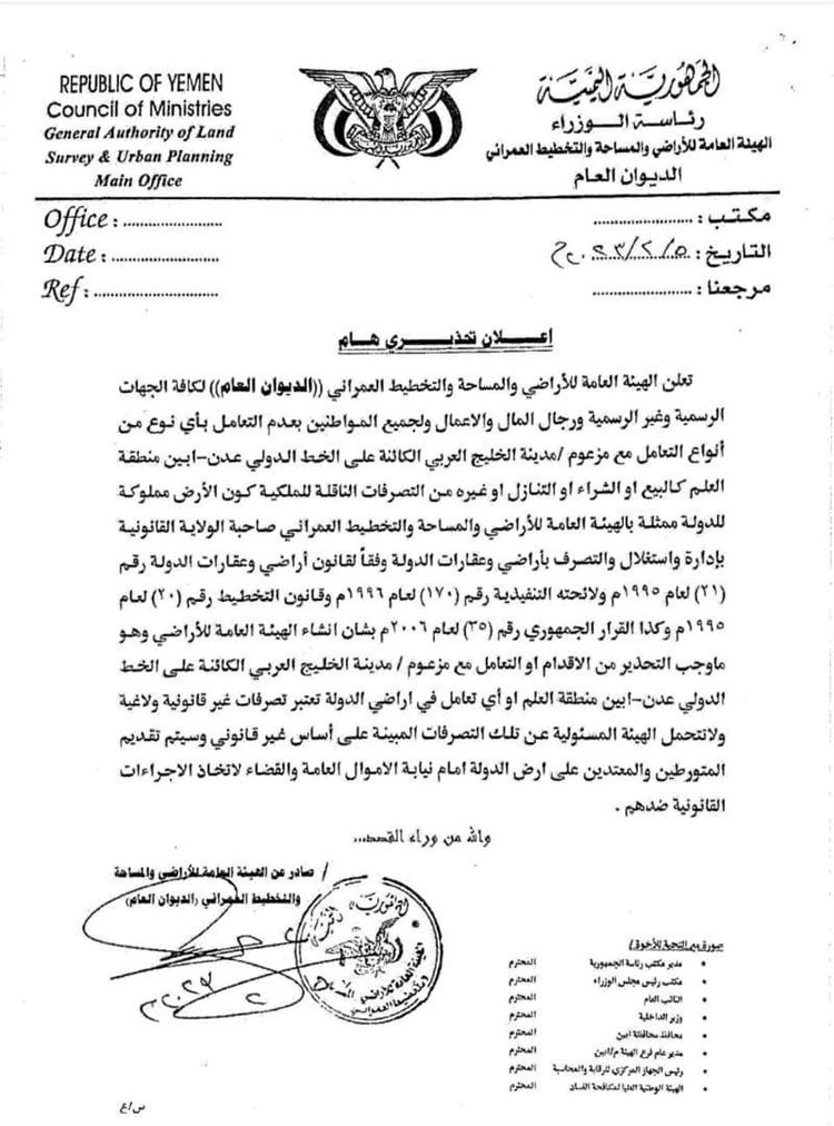 الهيئة العامة للاراضي والمساحة والتخطيط العمراني - الديوان العام عدن ، حذرت في اكثر من بيان اعلامي من التعامل مع ما يسمى بـ " مشروع مدينة الخليج العربي " ، مؤكدة في اعلانات رسمية صادرة عنها ان التصرفات التي قام بها فرع ابين بتشجيع من السلطة المحلية بالمحافظة تعتبر اجراءات باطلة يتحمل مسؤوليتها المتصرفين.