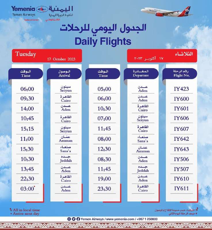 ونشرت اليمنية جدول لرحلاتها اليومية اطلع عليه محرر عدن الغد حيث جاءت رحلة غدا الثلاثاء من مطار صنعاء إلى الأردن، ضمن جدول الرحلات اليومية