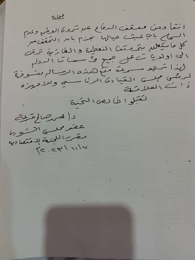 ووجه قرعة رسالته الى رئيس مجلس الشورى وكافة الجهات العليا في الدولة مطالبا بموقف واضح ومحدد من هذه الرسالة.