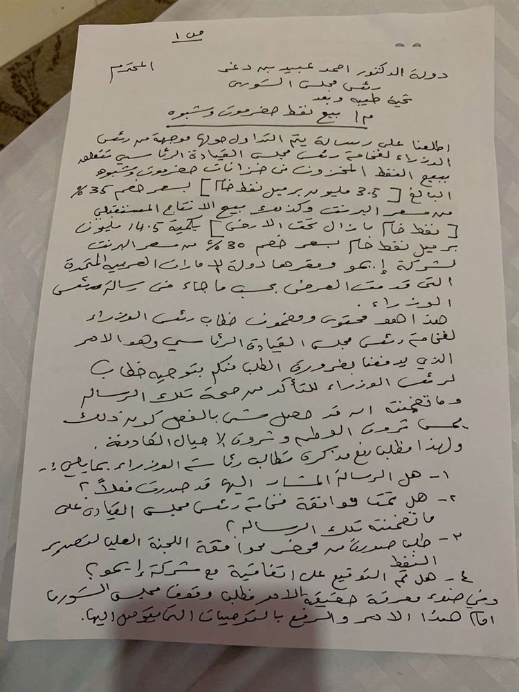 طالب عضو مجلس الشورى محمد صالح قرعة بموقف حكومي واضح وجاد من رسالة يتم تداولها ومنسوبة لرئيس الوزراء حول بيع كميات النفط اليمنية الى شركة اجنبية.