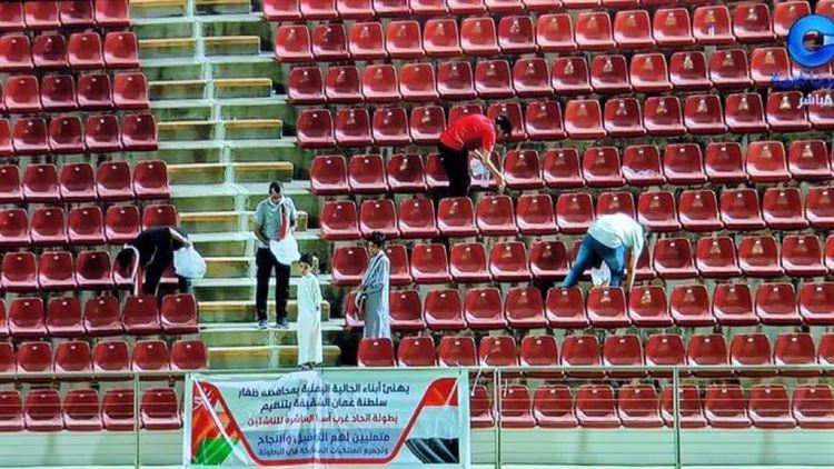 تداول نشطاء على مواقع التواصل الاجتماعي صورة لمشجعي المنتخب اليمن وهو ينظف المدرجات عقب انتهاء المباراة بين اليمن والعراق، يوم أمس، في مجمع السعادة الرياضي بمدينة صلالة محافظة ظفار.