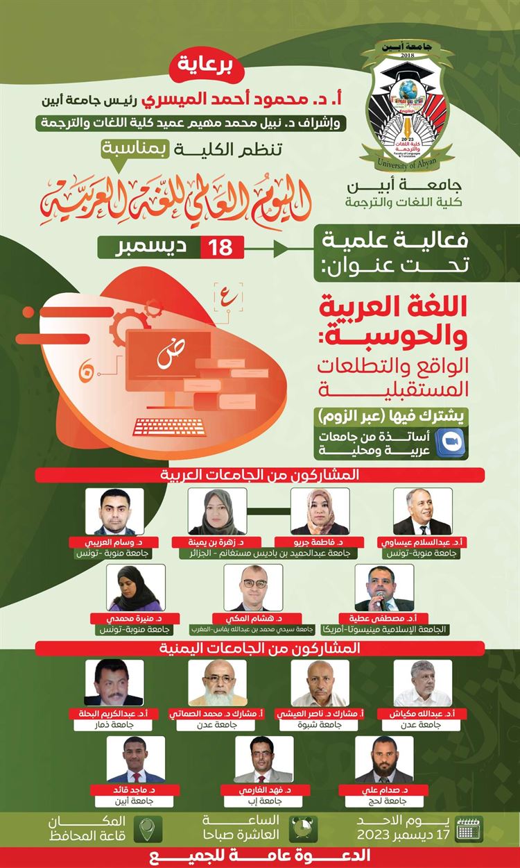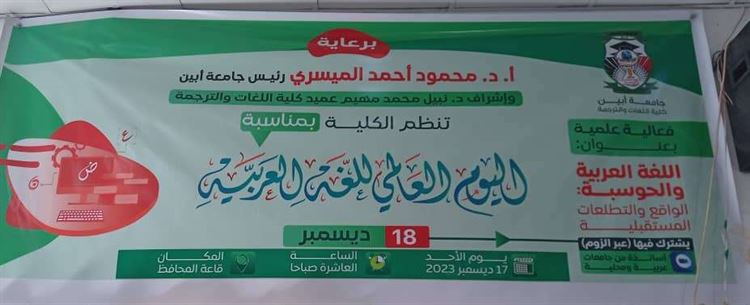 بمناسبة اليوم العالمي للغة العربية نظمت كلية اللغات والترجمة بجامعة أبين فعالية علمية تحت عنوان " اللغة العربية، والحوسبة: الواقع والتطلعات المستقبلية صباح اليوم الأحد بقاعة المحافظ في الجامعة بزنجبار..حضرها د. محمود الميسري رئيس جامعة أبين، ونوابه وعدد من عمداء كليات الجامعة وجمع من المهتمين والكلبة والطالبات.. وبدأت الفعالية بتلاوة آيات من القرآن الكريم لد.عبدالسلام راجح رئيس نقابة التدريس بالجامعة تلته كلمتان مرحبتان بالحاضرين، وكل الدكاترة المشاركين من الوطن ومن خارجه، ومؤكدتان على أهمية الاحتفال باللغة العربية في يوم عرسها العالمي البهيج ، وتجليها الجميل، الأنيق، والاحتفاء بها بما يليق..