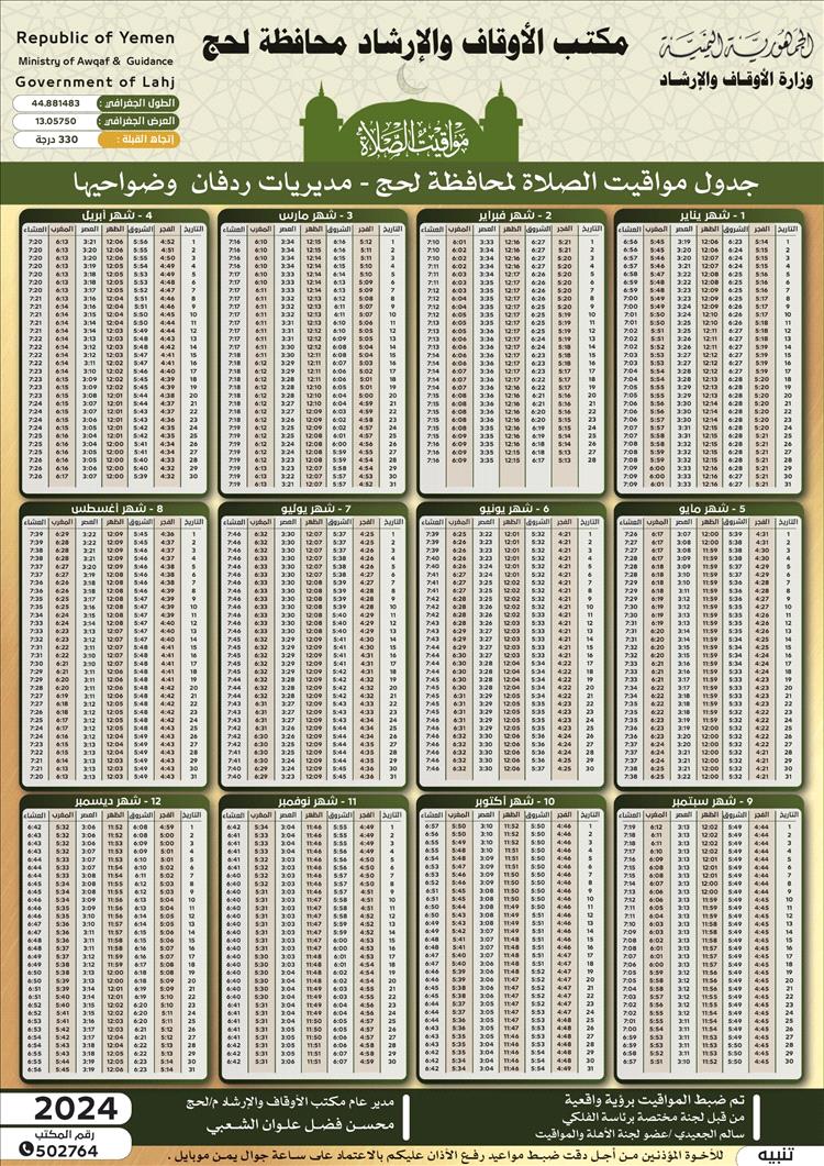 وزع مكتب الأوقاف والإرشاد في مديرية حالمين بمحافظة لحج امس الأربعاء 6 مارس 2024 جدول مواقيت الصلاة على الأئمة والخطباء في المديرية.;