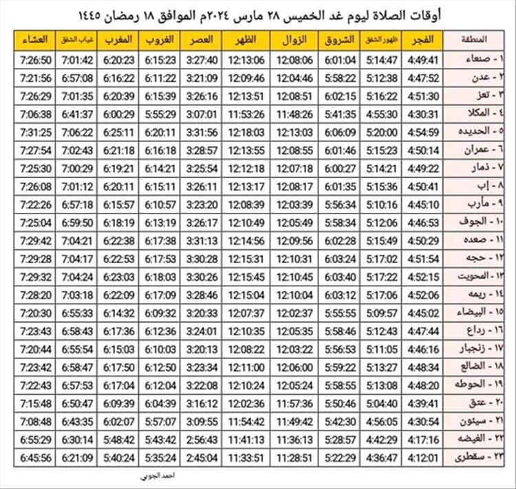 وجاء تحديد أوقات الصلاة لليوم 28 مارس 2024م الموافق 18 رمضان 1445، بحسب ما نشر الجوبي، كالتالي: