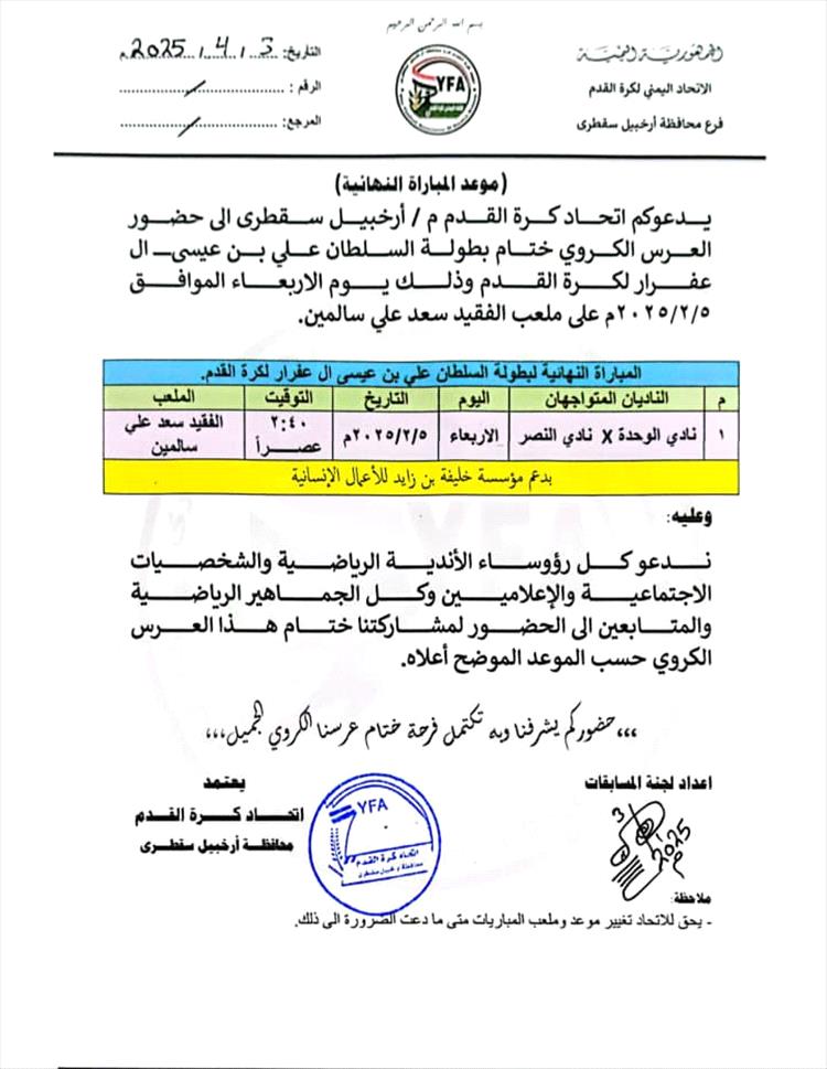 وبحسب التصريح الرسمي من اتحاد كرة القدم، فإن المباراة النهائية التي ينتظرها عشاق كرة القدم في سقطرى بشغف، ستجمع بين فريقي نادي الوحدة ونادي النصر، وستُقام يوم الأربعاء 5 فبراير 2025م، على ملعب الفقيد سعد علي سالمين المعشب في العاصمة حديبو، في تمام الساعة 2:40 عصرًا. وقد دعا الاتحاد جميع رؤساء الأندية الرياضية، الشخصيات الاجتماعية البارزة، الإعلاميين، والجماهير الرياضية من مختلف الأعمار للمشاركة في هذا الحدث الكبير والمهم، الذي يُعد تتويجاً لجهود تنظيمية رياضية متميزة واحتفاءً بالعرس الكروي السقطري الذي يعكس تميز وتطور الرياضة في المنطقة.
