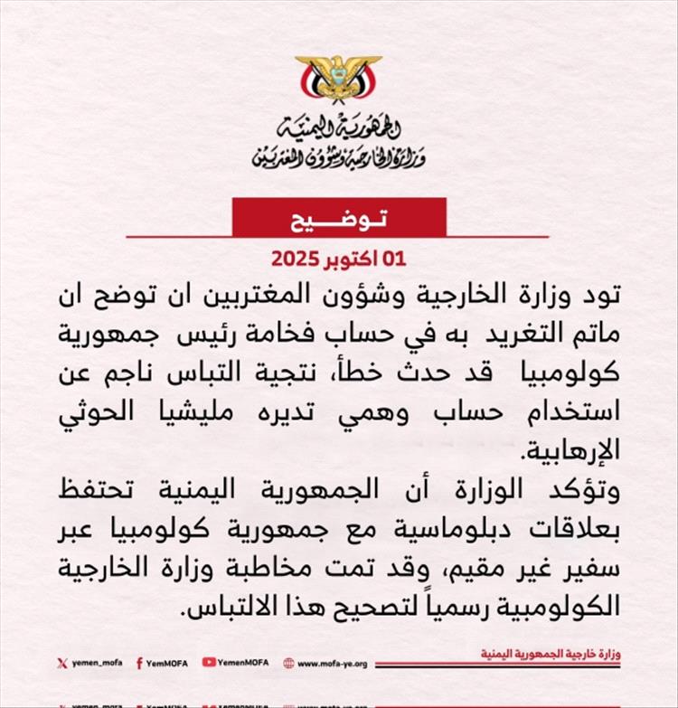 أمام هذا الالتباس، أصدرت وزارة الخارجية بياناً توضيحياً أكدت فيه أن ما نشره الرئيس الكولومبي جاء عن طريق الخطأ، مشيرة إلى أن الحساب الذي استند إليه وهمي وتديره جماعة الحوثي. وأوضحت الوزارة أن الجمهورية اليمنية تحتفظ بعلاقات دبلوماسية مع كولومبيا عبر سفير غير مقيم، مؤكدة أنها خاطبت الخارجية الكولومبية رسمياً لتصحيح اللبس.