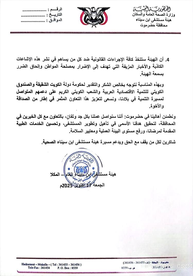 كما شددت الهيئة على أنها ستتخذ كافة الإجراءات القانونية ضد الجهات والأفراد الذين يروّجون لمثل هذه الأخبار الكاذبة، لما تسببه من أضرار تمس سمعة المستشفى وتسيء إلى الجهود المبذولة لخدمة أبناء حضرموت.