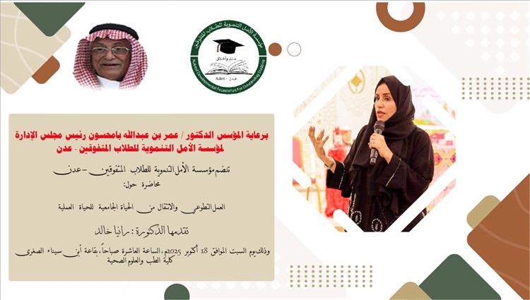 جاء ذلك لدى افتتاحه وحضوره فعاليات الدورة التدريبية عن: *(العمل التطوعي والانتقال من الحياة الجامعية إلى الحياة العملية)*، التي أقيمت برعاية سفير النوايا الحسنة الدكتور عمر بامحسون، ونظمتها مؤسسة الأمل التنموية للطلاب المتفوقين بعدن اليوم السبت (18 أكتوبر2025م)، بقاعة ابن سيناء بكلية الطب والعلوم الصحية بجامعة عدن.
