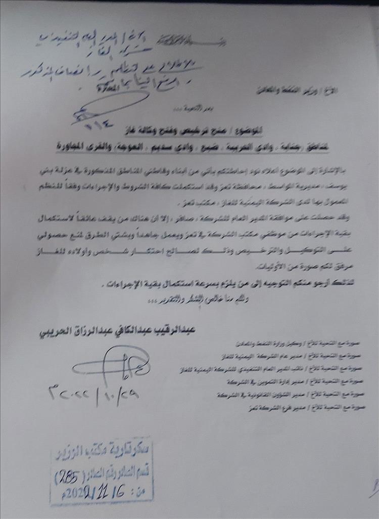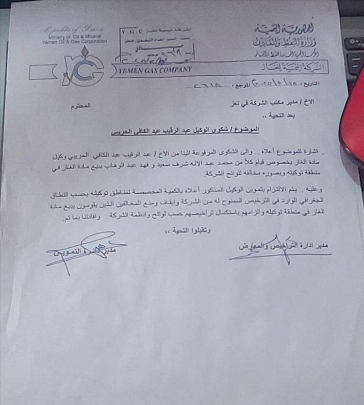وقال الوكيل عبدالرقيب عبدالكافي الحريبي إن لديه كافة الصلاحيات والتراخيص والإجراءات التي تسمح له ببيع الغاز للمناطق التي تقع في عزلته (بني يوسف – مديرية المواسط)، إلا أنه يلاقي عرقلة كبيرة.