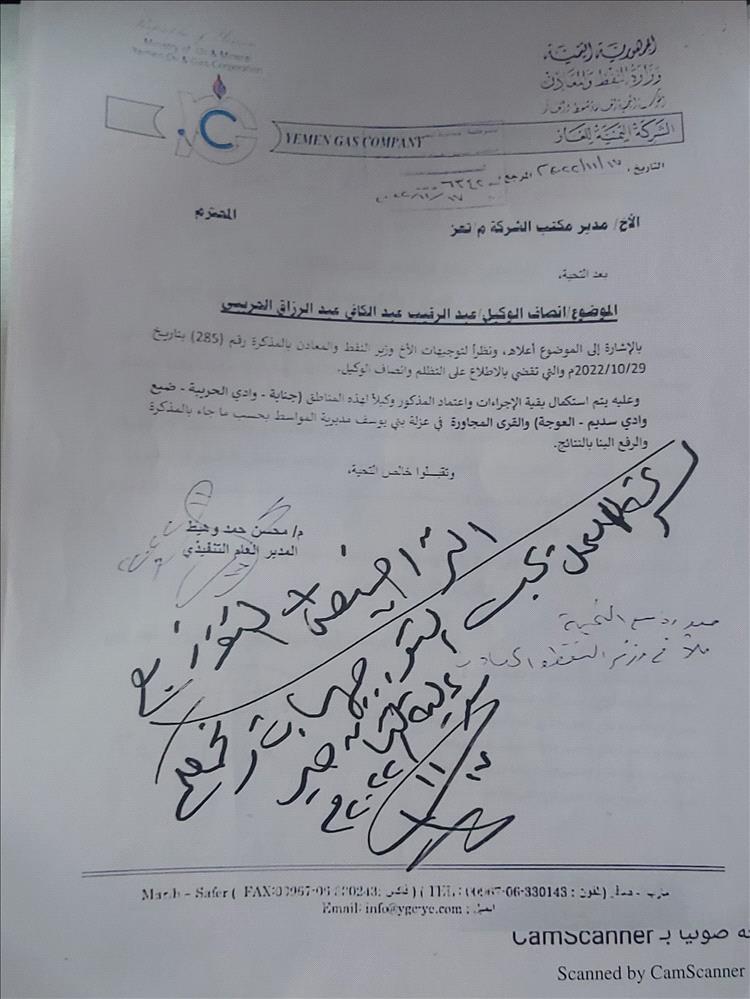 وناشد وزير النفط ومدير عام شركة صافر للغاز ومحافظ محافظة تعز بتنفيذ الإجراءات والتوجيهات الصادرة لهم، وما جاء في الترخيص رقم (11) الصادر من الشركة عام 2024، وإنصافه ليستمر في عمله.