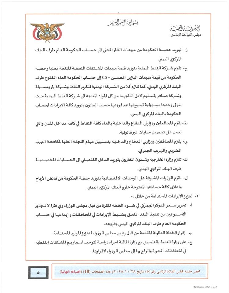 وبحسب الوثائق الرسمية، فإن الخطة التي بدأ تنفيذها اعتبارًا من 28 أكتوبر 2025م، تلزم السلطات المحلية والمحافظين بإيداع كافة الإيرادات في الحسابات الحكومية المركزية لدى البنك المركزي اليمني، ومنع أي رسوم أو استقطاعات غير قانونية. كما شددت على منع التدخل في أعمال المنافذ الجمركية، وإخضاع جميع الإيرادات والجبايات للإجراءات الرسمية المنظمة.