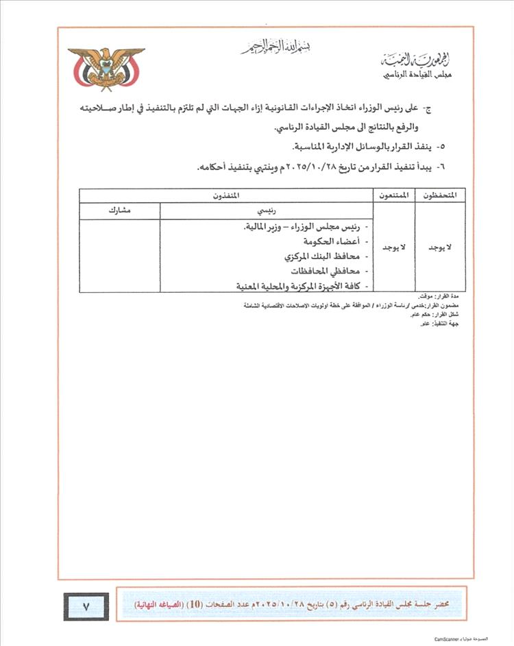 أقر مجلس القيادة الرئاسي القرار رقم (11) لعام 2025م، بشأن الموافقة على خطة أولويات الإصلاحات الاقتصادية الشاملة، الهادفة إلى معالجة الاختلالات المالية والإيرادية وتوحيد الموارد العامة في البنك المركزي اليمني.