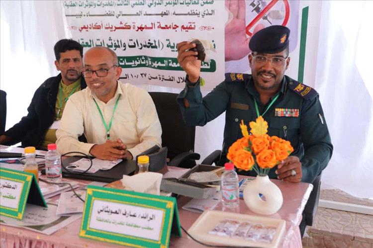نُظّمت بمدينة الغيضة ندوة توعوية لطلاب وطالبات ثانويات حسان بن ثابت للبنين وبلقيس والدرعية للبنات، ضمن الأنشطة المصاحبة للمؤتمر العلمي الدولي الثالث عن المخدرات والمؤثرات العقلية الذي ينظمه المعهد العالي للقضاء في ليبيا طرابلس بمشاركة جامعة المهرة كشريك أكاديمي، وبرعاية محافظ محافظة المهرة الأستاذ محمد علي ياسر، ورئيس جامعة المهرة معالي الدكتور أنور محمد كلشات، وإشراف نيابة الدراسات العليا والبحث العلمي بالجامعة، وتنفيذ مركز التدريب والتأهيل وخدمة المجتمع، وبالشراكة مع إدارة الأمن والشرطة ومكاتب التربية والتعليم، والصحة العامة والسكان، والأوقاف والإرشاد، والشؤون الاجتماعية والعمل بالمحافظة.