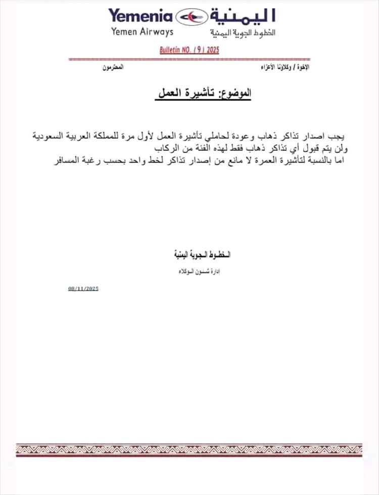 أصدرت شركة الخطوط الجوية اليمنية، السبت، تنبيهًا هامًا للمسافرين إلى المملكة العربية السعودية، وخاصةً لمن يحملون تأشيرة عمل لأول مرة، مؤكدة أنه ابتداءً من السبت ٨ نوفمبر لن يتم قبول إصدار تذكرة باتجاه واحد فقط، ويجب حجز تذكرة (ذهاب وعودة) معًا كشرط أساسي لإتمام الحجز والدخول.