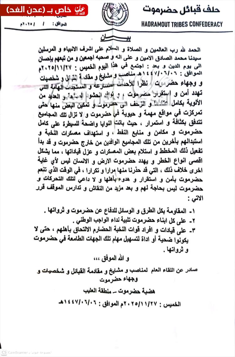 واختتم البيان بالتأكيد على أن المرحلة تتطلب وحدة صف أبناء حضرموت لحماية أمن المحافظة وثرواتها من أي محاولات تهدف لزعزعة استقرارها.