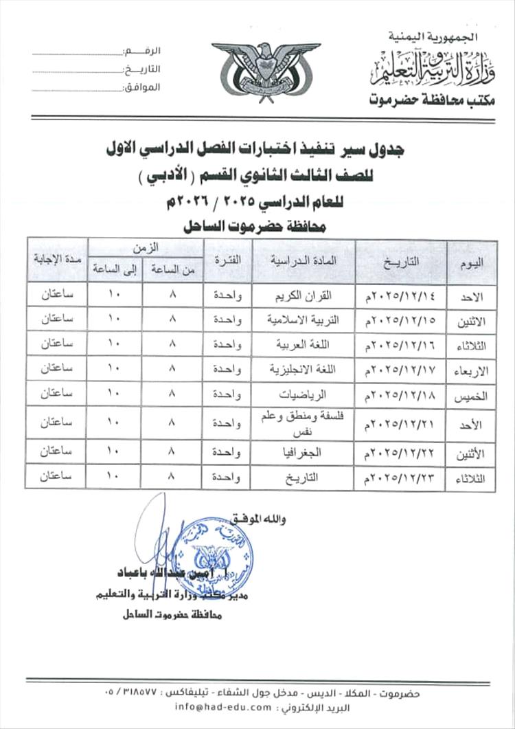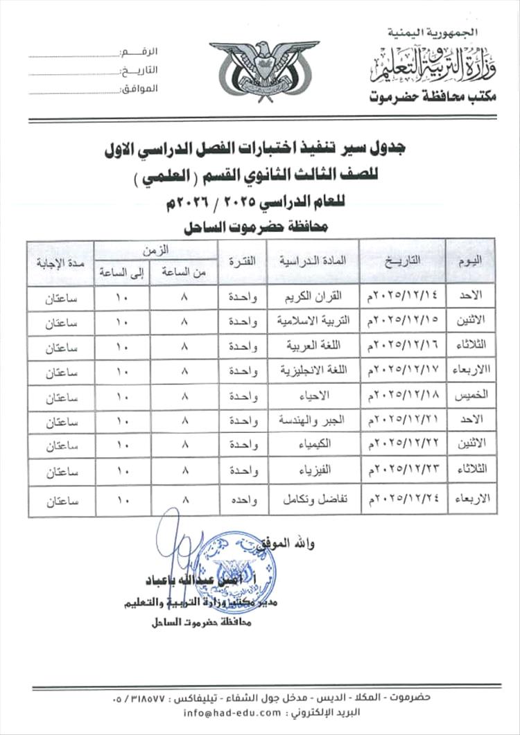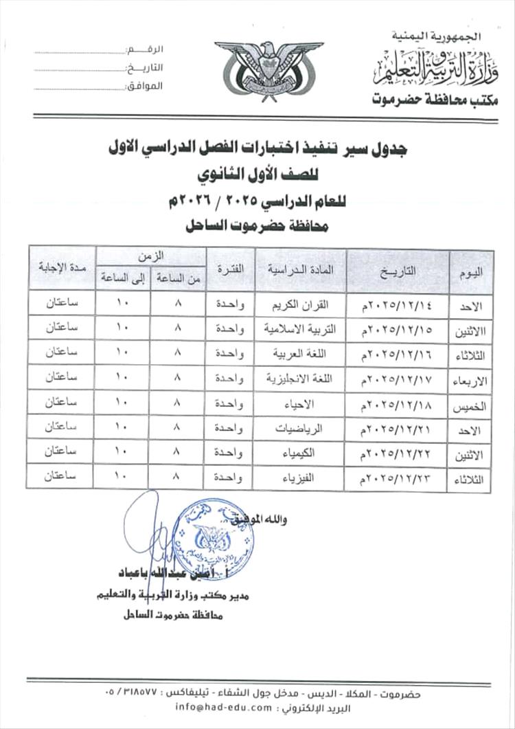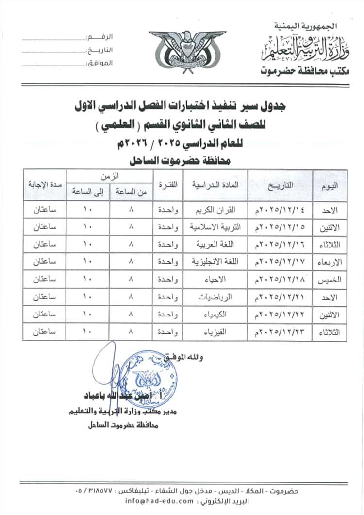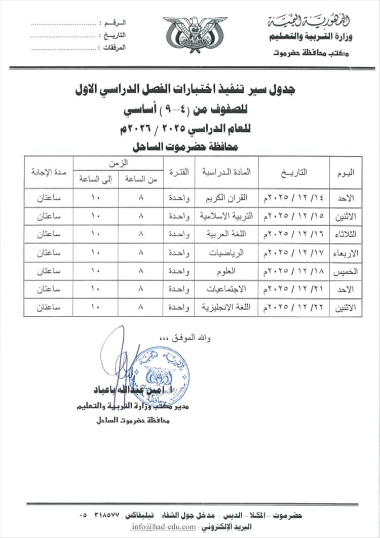 أصدر مكتب وزارة التربية والتعليم بمحافظة حضرموت جدول اختبارات الفصل الدراسي الأول من العام الدراسي 2025-2026م لجميع المراحل الدراسية .
