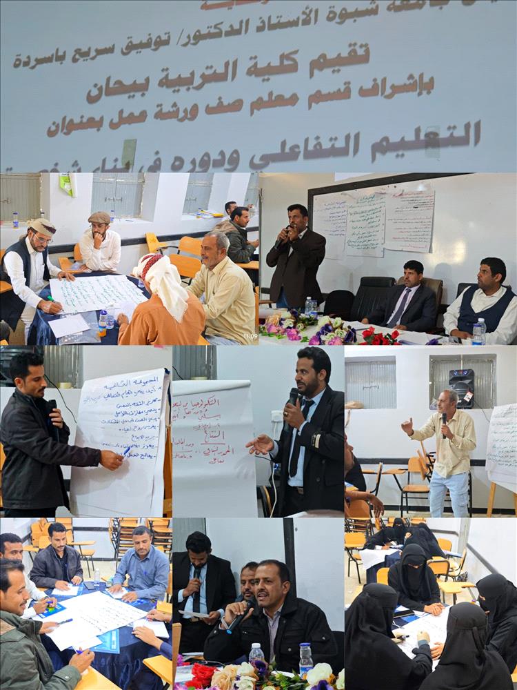 تحت رعاية الأستاذ الدكتور توفيق سريع باسردة رئيس جامعة شبوة، أقيمت بكلية التربية بيحان صباح اليوم الثلاثاء الموافق 2/ 12/ 2025م. بإشراف قسم معلم صف ضمن أنشطته العلمية للعام الجامعي 2025/ 2026م ورشة علمية تحت عنوان: " التعليم التفاعلي ودوره في بناء شخصية التلميذ في الصفوف الأولى (1 ـ 3)". بمشاركة عدد من المعلمين والمعلمات من مختلف مدارس المديرية، وذلك ضمن برامج الكلية الهادفة إلى تطوير العملية التعليمية وتحديث أساليب التدريس.
