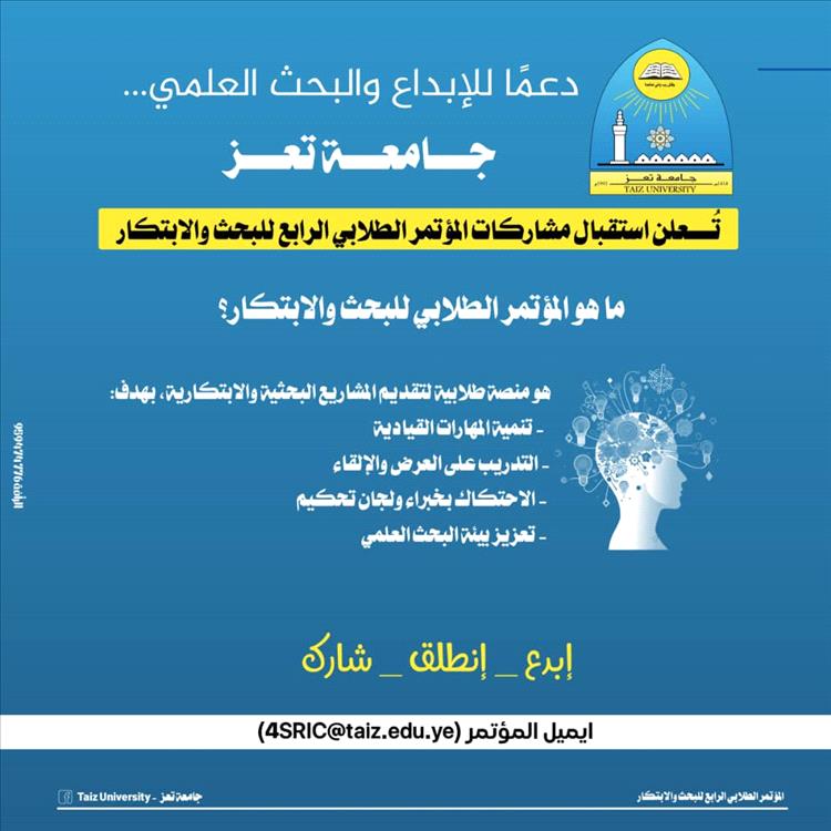 وتدعو جامعة تعز، جميع طلبتها إلى المشاركة الفاعلة في هذا الحدث العلمي الكبير، الذي يعكس رؤيتها في تعزيز الابتكار وبناء مستقبل طلابي مستدام.