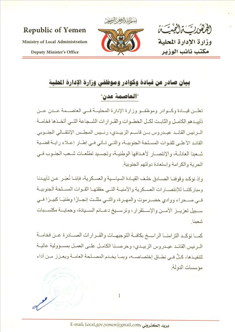 أصدر نائب وزير و قيادة وكوادر وموظفو وزارة الإدارة المحلية في عدن بيانًا أكدوا فيه تأييدهم الكامل والثابت لكافة الخطوات والقرارات التي اتخذها المجلس الانتقالي الجنوبي، بقيادة اللواء عيدروس قاسم الزُبيدي، رئيس المجلس الانتقالي الجنوبي، القائد الأعلى للقوات المسلحة الجنوبية.