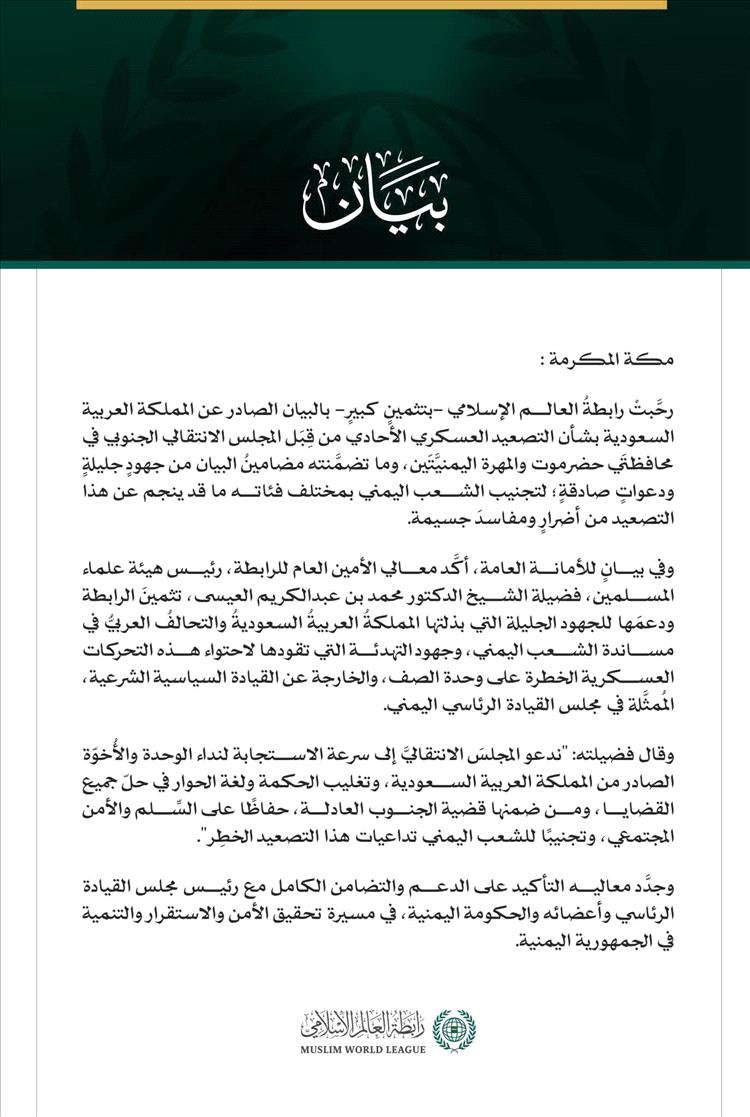 رحّبت رابطة العالم الإسلامي بالبيان الصادر عن المملكة العربية السعودية بشأن التطورات الأخيرة في محافظتي حضرموت والمهرة، مثمّنة ما تضمنه من جهود ومساعٍ صادقة تهدف إلى تجنيب الشعب اليمني بمختلف فئاته ما قد يترتب على الأوضاع الراهنة من أضرار وتداعيات جسيمة.