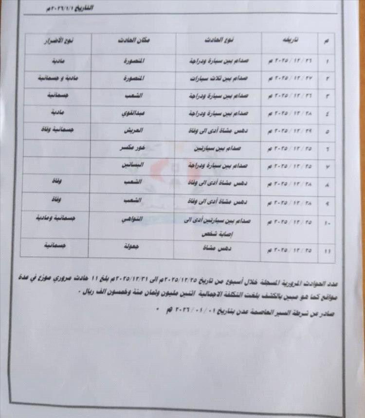 أفادت إدارة شرطة السير بالعاصمة عدن في تقريرها الأسبوعي، بتسجيل 11 حادثًا مروريًا خلال الفترة من 25 إلى 31 ديسمبر 2025م في عدد من مديريات العاصمة، أسفرت عن 3 حالات وفاة وعدد من الإصابات إضافة إلى أضرار مادية، قُدّرت تكلفتها الإجمالية بمليونين وثمانمائة وخمسين ألف ريال.