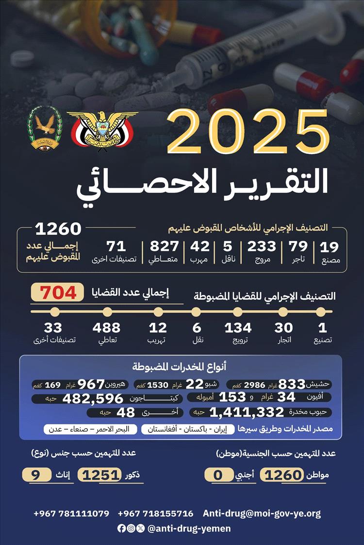 أكد مدير عام مكافحة المخدرات بوزارة الداخلية العميد عبدالله أحمد لحمدي، ، أن الإدارة العامة لمكافحة المخدرات، وبالتنسيق مع فروعها في المحافظات، والأجهزة الأمنية والعسكرية ونقاط الجيش في المحافظات المحررة، حققت خلال عام 2025م نجاحات أمنية كبيرة في مواجهة جرائم المخدرات والحد من انتشارها.