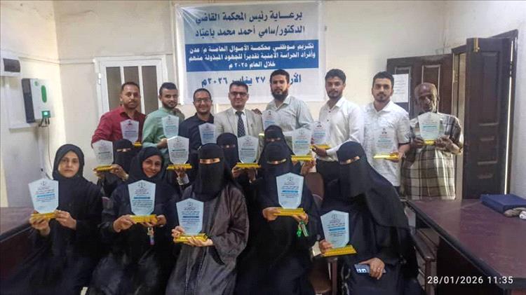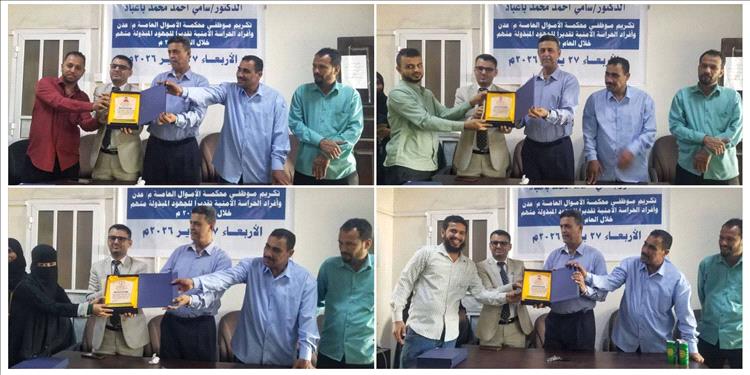 وجرى حفل التكريم بحضور رئيس شعبة استئناف الأموال العامة القاضي خليل عبداللطيف، ورئيس نقابة الموظفين الإداريين بالسلطة القضائية، سقاف المحضار، وعضو النقابة، أحمد دبان، وعدد من القضاة والموظفين.
