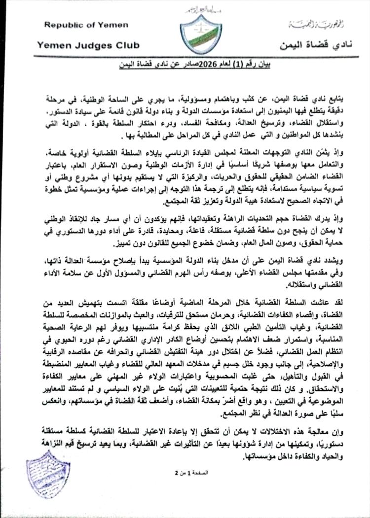 وإذ يثمّن النادي التوجهات المعلنة لمجلس القيادة الرئاسي بإيلاء السلطة القضائية أولوية خاصة، والتعامل معها بوصفها شريكًا أساسيًا في إدارة الأزمات الوطنية وصون الاستقرار العام، باعتبار القضاء الضامن الحقيقي للحقوق والحريات، والركيزة التي لا يستقيم بدونها أي مشروع وطني أو تسوية سياسية مستدامة، فإنه يتطلع إلى ترجمة هذا التوجه إلى إجراءات عملية ومؤسسية تمثل خطوة في الاتجاه الصحيح لاستعادة هيبة الدولة وتعزيز ثقة المجتمع.