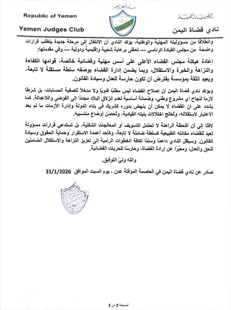 وانطلاقًا من مسؤوليته المهنية والوطنية، يؤكد النادي أن الانتقال إلى مرحلة جديدة يتطلب قرارات واضحة من مجلس القيادة الرئاسي، وفي مقدمتها إعادة هيكلة مجلس القضاء الأعلى على أسس مهنية وقضائية خالصة، قوامها الكفاءة والنزاهة والخبرة والاستقلال.