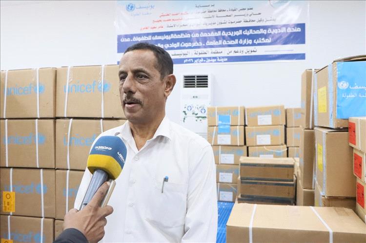 دشن وكيل محافظة حضرموت لشئون مديريات الوادي والصحراء الأستاذ عامر سعيد العامري ومعه الدكتور هاني خالد العمودي مدير عام مكتب وزارة الصحة العامة والسكان بحضرموت الوادي والصحراء، يوم الاثنين الموافق 2 فبراير 2026م منحة الادوية والمحاليل الوريدية المقدمة من منظمة اليونيسيف للطفولة، دعما للقطاع الصحي في مجال الرعاية الصحية، تلبية للنداء الذي وجهه مدير عام مكتب الوزارة للجهات الداعمة والمانحة للقطاع الصحي بالوادي والصحراء في الظروف الراهنة.