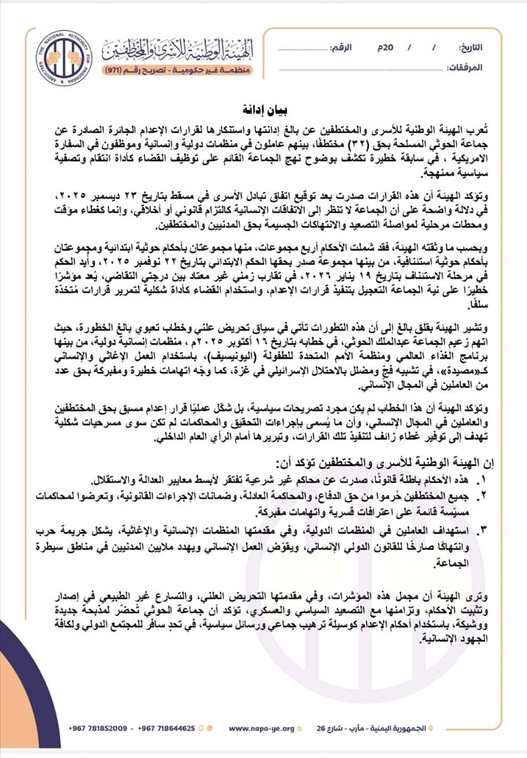 وأكدت "الهيئة" في بيان شديد اللهجة، أن هذه الأحكام صدرت بعد توقيع اتفاق تبادل الأسرى في مسقط بتاريخ 23 ديسمبر 2025، في دلالة قالت "إنها تعكس عدم تعامل الجماعة مع الاتفاقات الإنسانية باعتبارها التزامًا قانونيًا أو أخلاقيًا، وإنما غطاءً مؤقتًا لمواصلة التصعيد والانتهاكات بحق المدنيين والمختطفين".